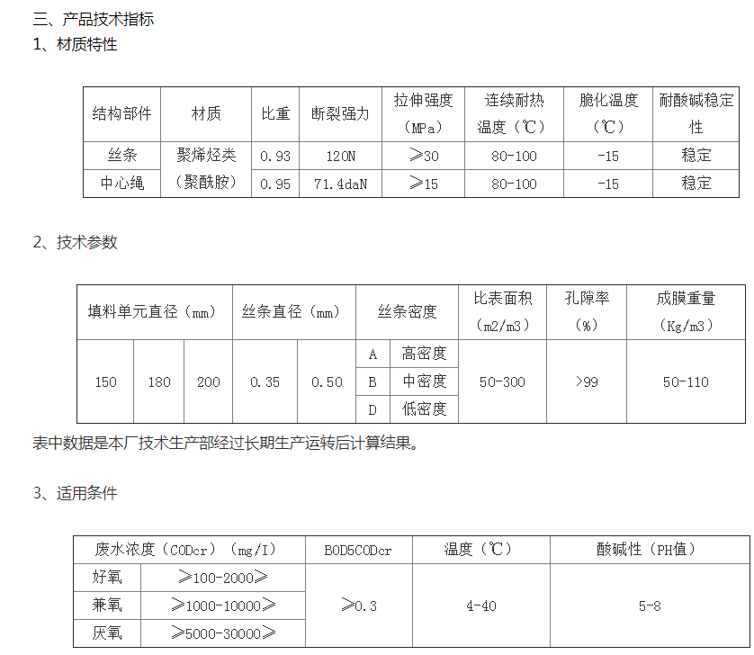 該填料篩選了聚烯烴類和聚酰胺中的幾種耐腐、耐溫、耐老化的品種,混合以親水、吸附、抗熱氧等助劑,采用拉絲,絲條制毛工藝,將絲條穿插固著在耐腐、高強(qiáng)度的中心繩上,絲條布置應(yīng)呈立體狀,絲條表面應(yīng)有微波紋,由于選材和工藝配方精良,剛?cè)徇m度,使絲條呈立體均勻排列輻射狀態(tài),制成了懸掛式立體彈性填料的單體,填料在區(qū)域內(nèi)能立體均勻舒展?jié)M布,使氣、水、生物膜得到充分混滲接觸交換,生物膜不僅能均勻地著床在每一根絲條上,保持良好的活性和空隙可變性,而且能在運行過程中獲得愈來愈大的比表面積,又能進(jìn)行良好的代謝,這一特征與現(xiàn)象是國內(nèi)目前其他填料不可比擬的。