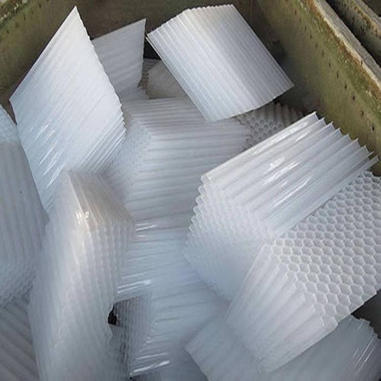 1、打開斜管填料包裝,將片斜管填料平放于地面,取第二片斜管填料置于片填料之上,檢查斜管填料的切口,必須保證60°角、并呈六角蜂窩狀,檢查無誤后開始燙接粘接點(diǎn);